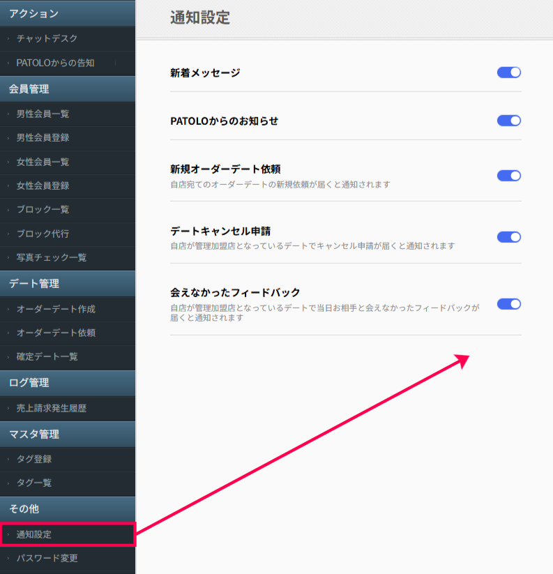 PATOLO管理画面から通知ON/OFFの設定が可能です。