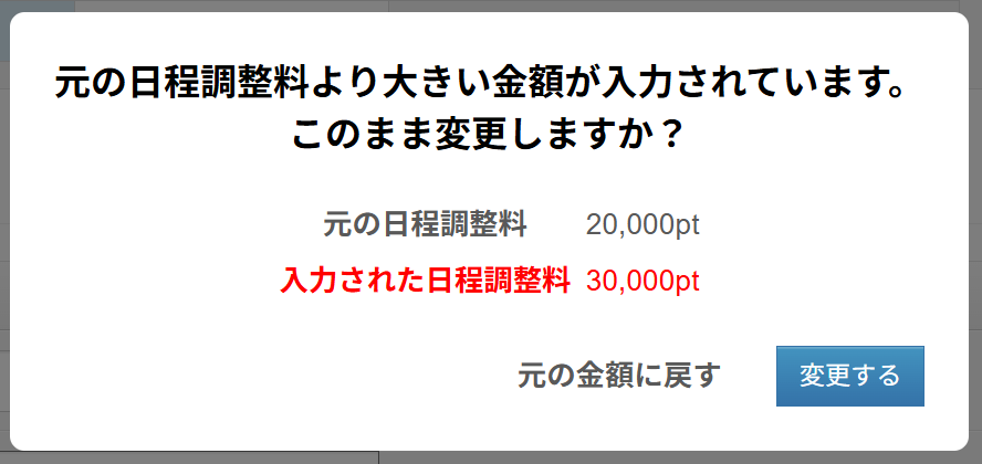 ※元の日程調整料よりも高い金額を入力した場合は確認画面が出ます。