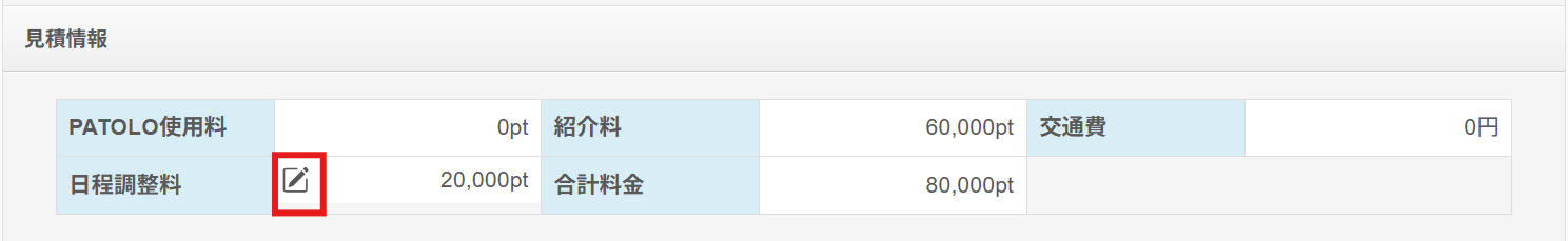 ①日程調整料を変更したいオーダーデート編集画面を開き、見積情報の「日程調整料」の鉛筆アイコンをクリック