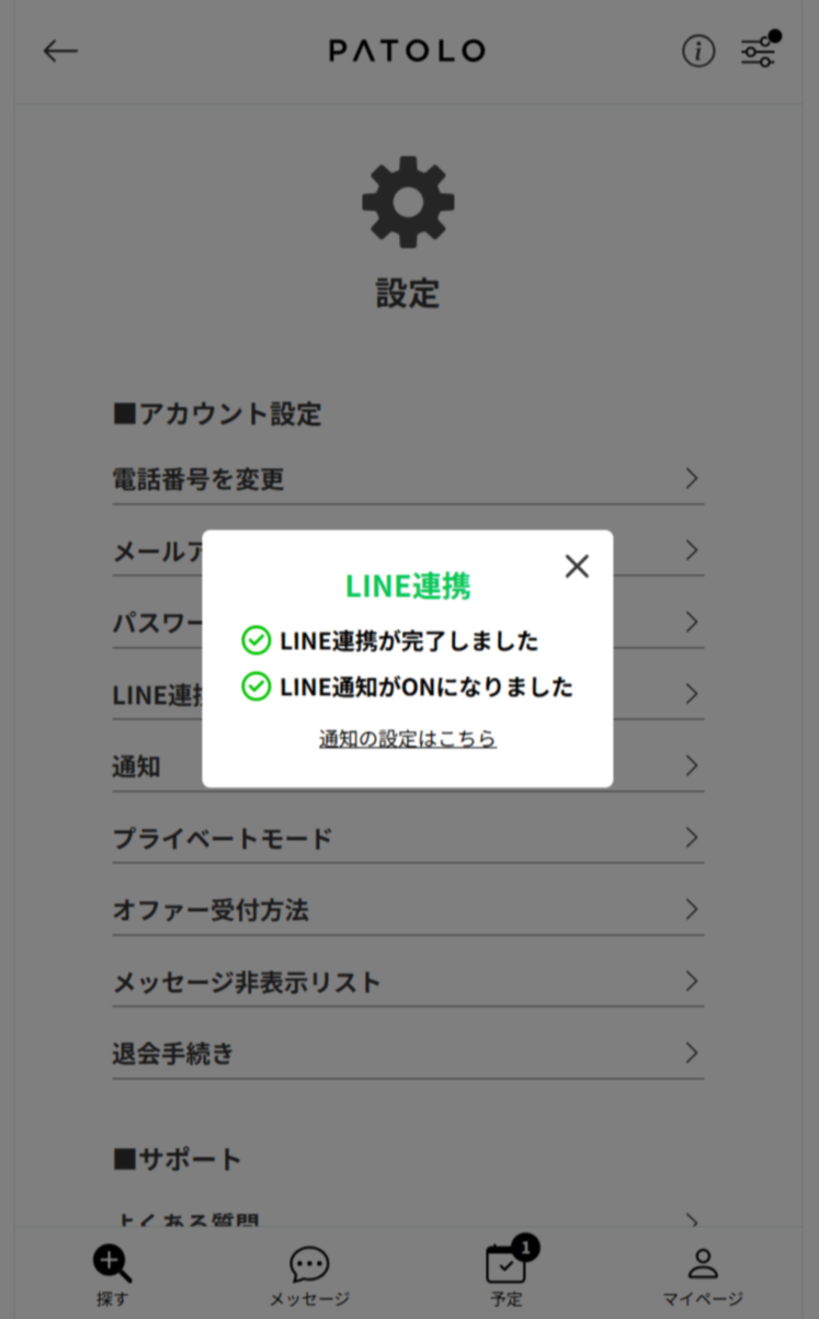 「通知設定」画面にて受信設定できる通知の種類 【会員メッセージの受信】 ・異性からのメッセージ ・デート関連の自動通知 (申込 / 成立 / 不成立 / キャンセル) 【コンシェルジュからの受信】 スタッフからのメッセージ 【PATOLOからの受信】 ・PATOLOサポートからのメッセージ ・デート前日のお知らせ ・フィードバックご投稿のお願い (デート翌日未投稿の方のみ) ・翌月失効されるポイント通知 (毎月第2月曜日メール配信) LINE通知は通知設定画面でONにしただけでは届きません。 ...