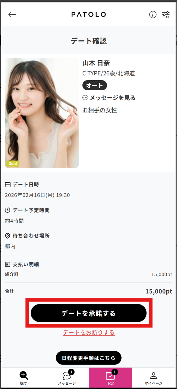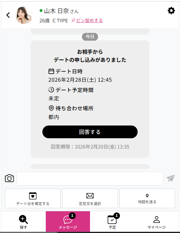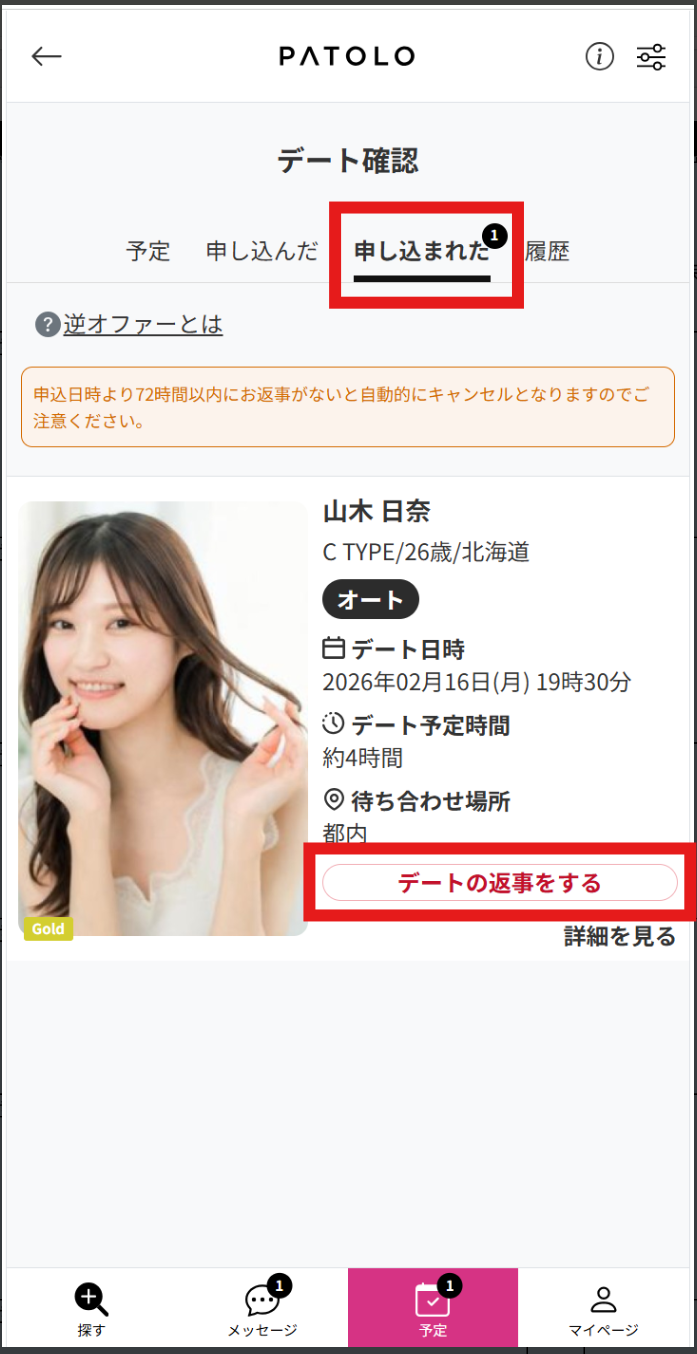 (男性)逆オファーは「予定」>「申し込まれた」、もしくはメッセージ画面内の通知からご確認いただけます。